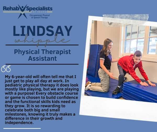 “My 6-year-old will often tell me that I just get to play all day at work. In pediatric physical therapy it does look mostly like playing, but we are playing with a purpose! Every obstacle course or game is chosen to build confidence and the functional skills kids need as they grow. It is so rewarding to celebrate both big and small milestones, knowing it truly makes a difference in their growth and independence.”